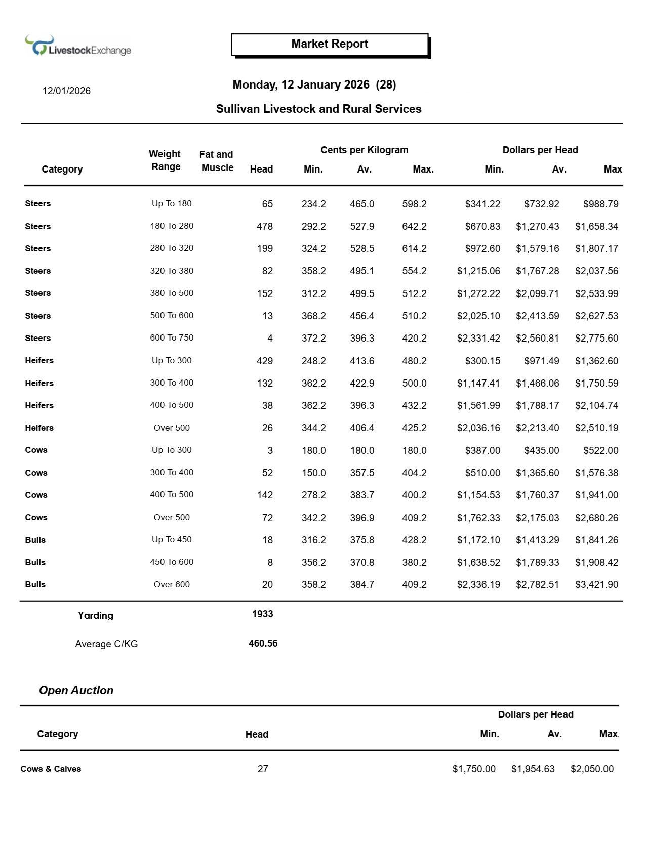 Sullivan Livestock yarded 1960 head of cattle for its first Liveweight sale on 12th January 2026. The market was stronger across all descriptions of cattle to start the year very strong. Cattle were drawn from Brooweena, Biggenden, Howard, Goomeri, Kilkivan, Woolooga, Proston, Booubyjan, Calgoa, Caloundra, Obi Obi and all local areas. The prime meatworks sale was very strong with bulls sold to a top of $4.11 ($2775), cows made to $4.13 ($2510) and prime heifers up to $4.25 ($2310). Not many bullocks to quote of any quality, with a top of $4.20 ($2395).